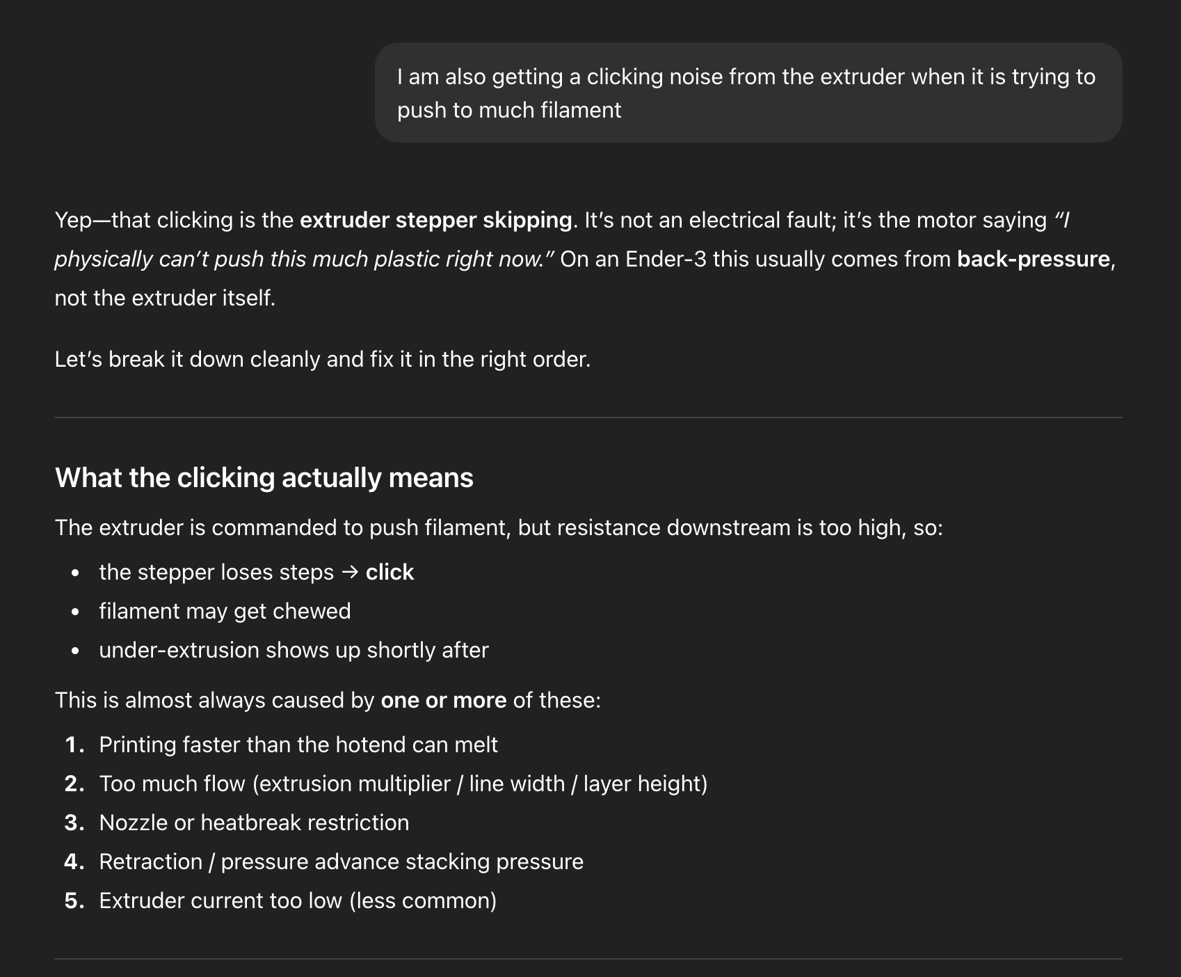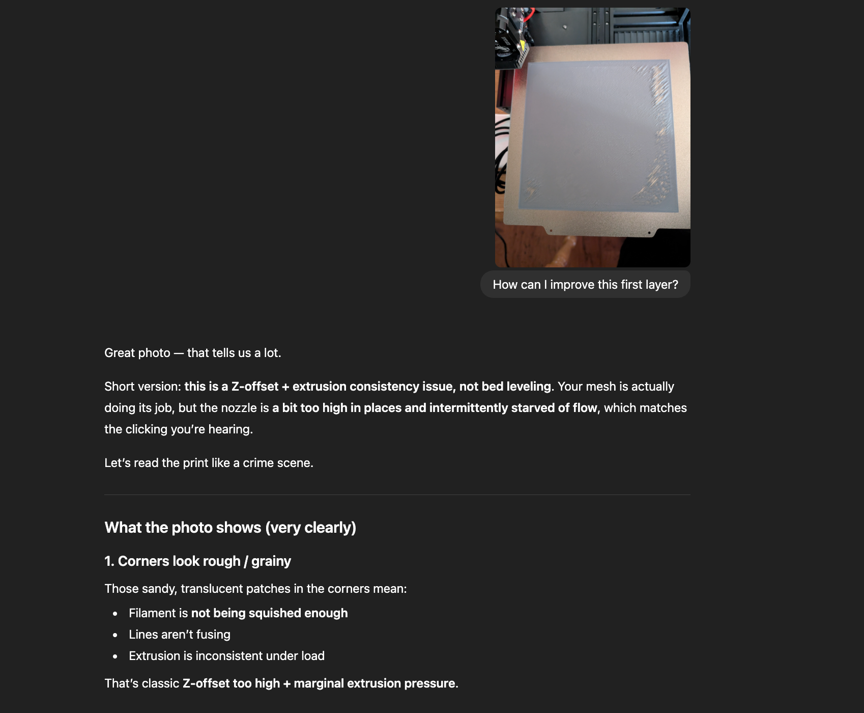 To solve the issue, I copied my Klipper config into ChatGPT. I provided details about what I was experiencing, along with information about my printer, an Ender 3 v2 with a Sprite Extruder and full linear rail mods. It quickly identified potential issues and suggested fixes to get the printer working again. I followed the steps, making the suggested tweaks, uploading pictures of the progress to get more suggestions, until I got a flawless first layer and began working to stop the Y-shifting issues. Once I had my Klipper config solid, I adjusted the printer settings to match Klipper and restarted my daughter's print. This was great. Instead of scouring the internet forums and YouTube Videos, running complete calibrations, or wasting extra time, I was able to pinpoint the issues and get the printer running great again. Now, when I press print, it just works.
